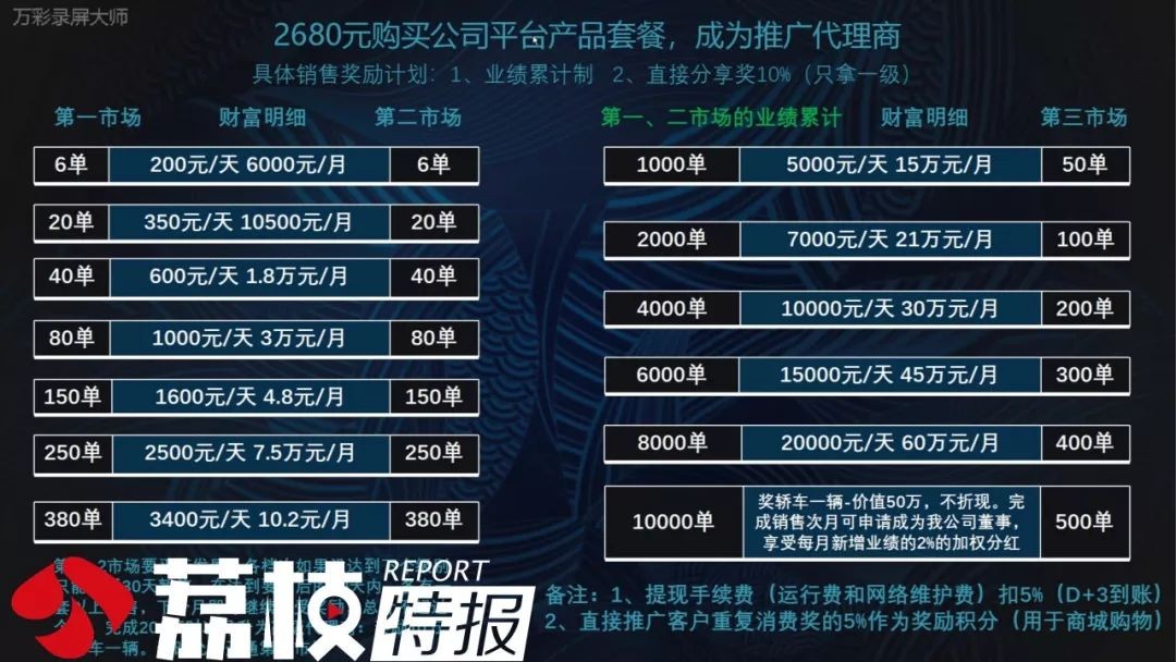 销售人员表示,“ 满150单的时候就可以拿1600一天,我们这里面的老师基本上一个月就能完成了。月收入几十万很正常啊!拉到250单的时候是2500一天,每天发放,等于7.5万一个月。380单的时候就是3400一天,这时候小封顶的时候公司会送你一辆10万块钱的轿车。”