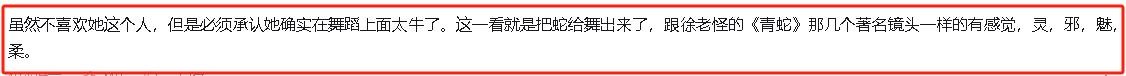“虽然不喜欢她这个人,但是必须承认她确实在舞蹈上面太牛了。这一看就是把蛇给舞出来了,跟徐老怪的《青蛇》那几个著名镜头一样的有感觉,灵,邪,魅,柔。”