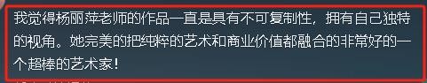 “我觉得杨丽萍老师的作品一直是具有不可复制性,拥有自己独特的视角。她完美的把纯粹的艺术和商业价值都融合的非常好的一个超棒的艺术家!”