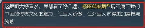 “这舞蹈太好看啦,我都看了好几遍,杨丽萍蛇舞展示属于我们中国的传统文化的魅力,让国人骄傲,让外国人觉得更加震撼与羡慕。”