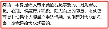 “舞蹈,本身是给人带来美的视觉享受的,对观者视觉,心理,情感带来积极,阳光向上的感觉,老幼皆可赏!如果让人观后产生恐惧感,实则是对大众的伤害!毕竟是给大众观看的。”