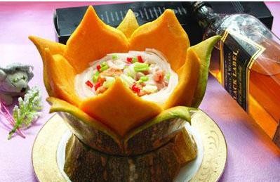 原料:鱼籽200克,鱼泡100克,鱼膏(即鱼油,和鱼子连在一起的部分)50克,白萝卜丝50克,青蒜20克,大蒜10克,芹菜段10克,干辣椒3克,南瓜容器1个。