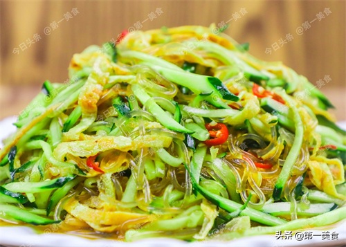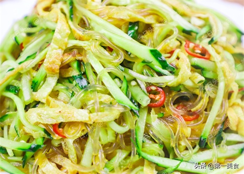 切点黄瓜丝和控过水的粉条放在盘里。