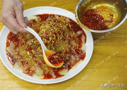 把小米辣 、蒜末都放在盆中,加盐 、味精、 白糖 、四勺生抽、 六勺陈醋 、三勺香油、六勺辣椒红油一搅这香味就出来了。