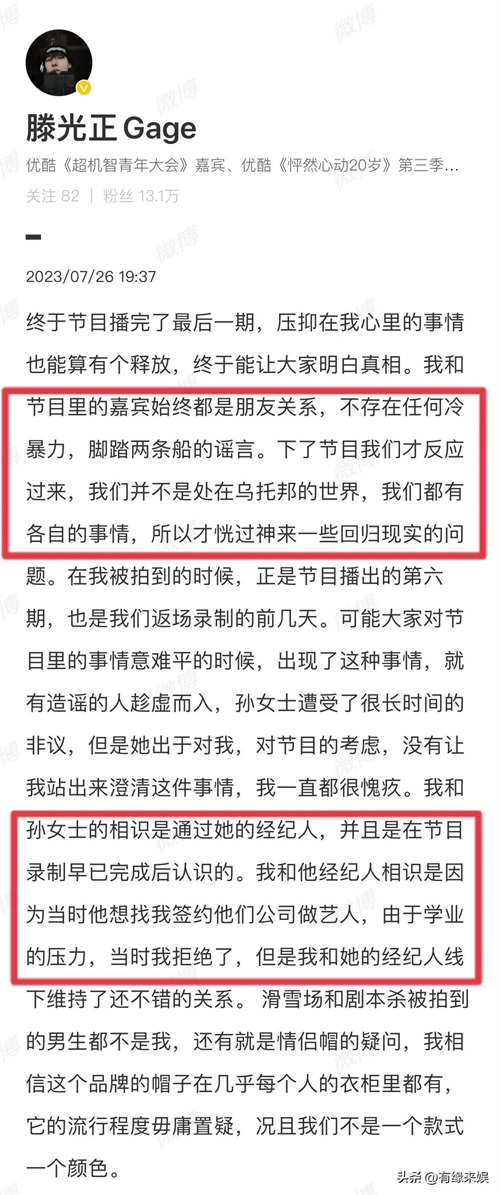 2023年7月26号,滕光正称自己没有脚踏两条船。
