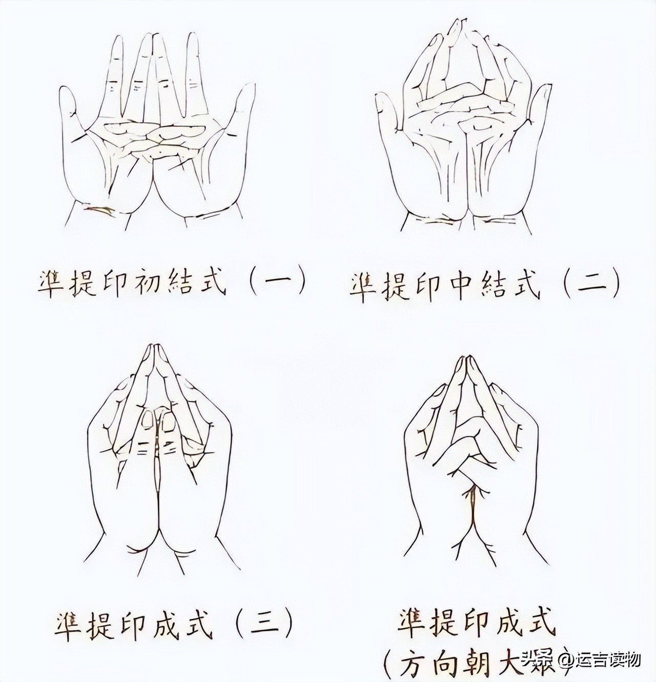一是准提菩萨特有的手印。准提菩萨的手印还是相当特别的,叫作“三股印”,这是修行的终极在于福德圆满与智慧圆满的意思。具体的手印大家可以看看下面这张图就相当明了了。