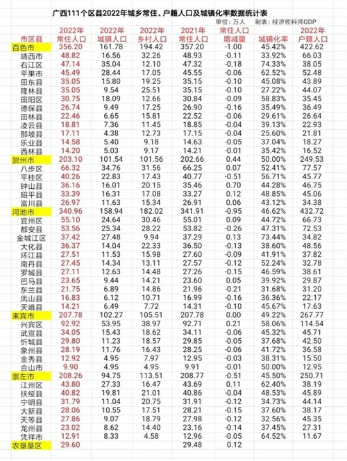 广西111个区县2022年城乡常住人口、户籍人口及城镇化率数据汇总