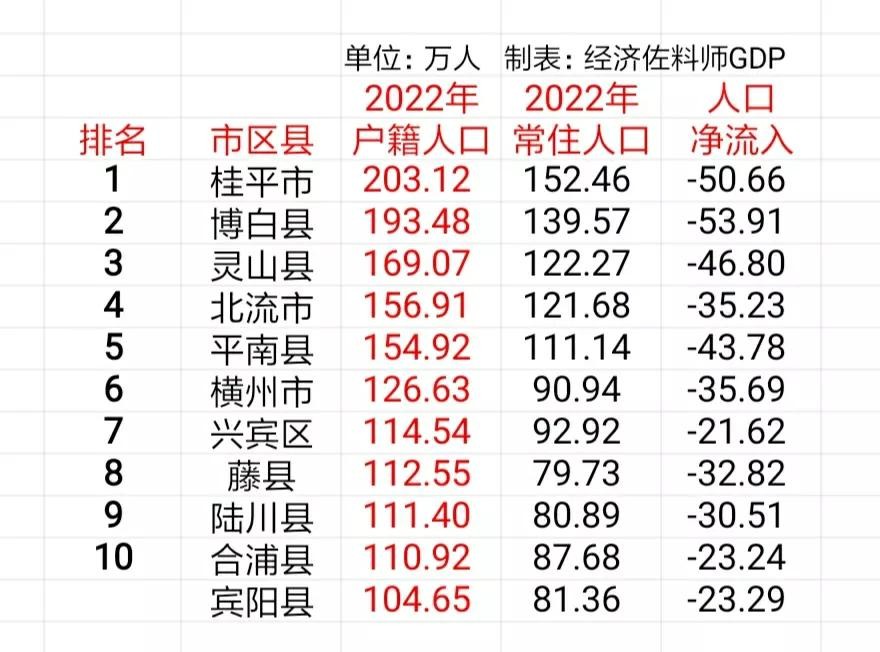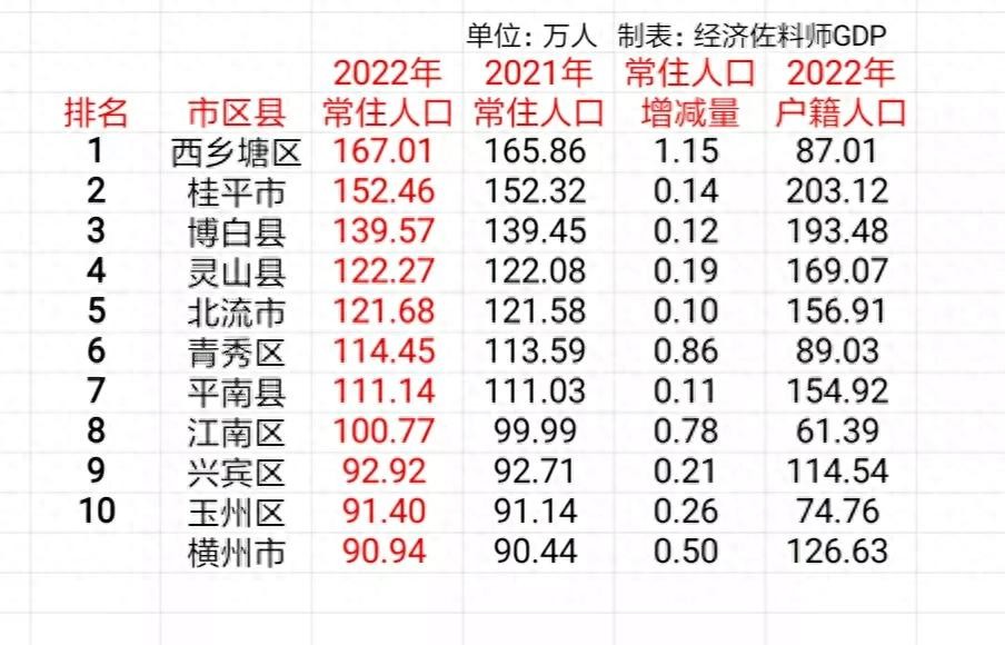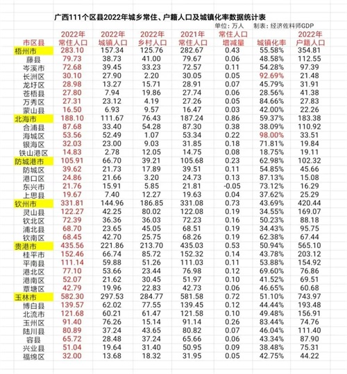 自治区2022年户籍人口5743.13万人,比常住人口多696.13万人,这部分人口大多数应该是去广东了。下表是全区户籍人口超过百万人的区县: