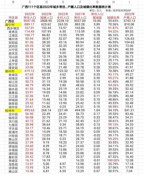 根据广西自治区最新的2023年统计年鉴整理了自治区111个区县的2022年城乡常住人口数据、户籍人口数据以及城镇化率数据,按照14个地级市所辖区县内部按常住人口多少进行排序。(表格最后附有广西农垦恳区常住人口数据)
