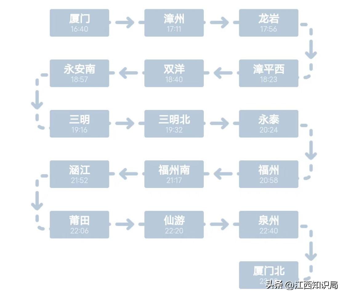 途经线路:沿鹰厦铁路、杭深线、龙漳线、南三龙铁路、昌福线、福平线、杭深线等运行。厦门站至厦门北最快的路线应该是,沿鹰厦线、厦门北联络线,全程只需22分钟,截止目前,每天有25班次高铁/动车。厦门站至厦门北站南的福建环形高铁,除D9618次还有一班次为D6318次,全程耗时为6小时9分钟。