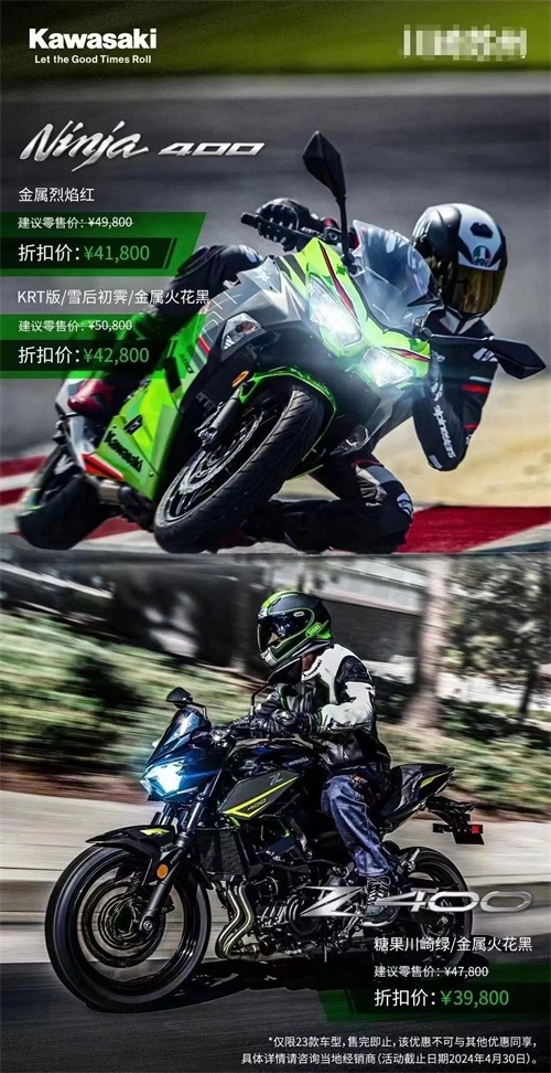 在车友群里,也有车友分享了部分地区销售的降价信息,两款400车型都是直降8000元,包括了NINJA 400 原价49800元起,现价41800, Z 400 也从原价47800元 降为39800元,但是是限时优惠。