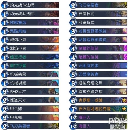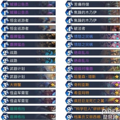 这一卡组包含有新卡怪盗军需官,在三费的时候,不仅具有质量生物回甲而且还可以进行补牌,在八费的时候,玩家可以将机械大表哥加入到卡组中,之后再将两个乱斗、两个战路以及两个灾祸加入到卡组中。