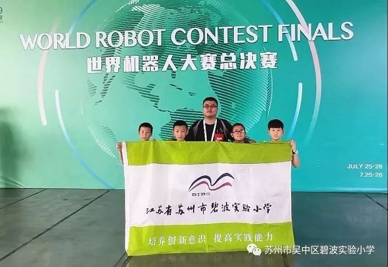 吴中区碧波实验小学机器人战队由叶文俊、冯潘老师带队,4位参赛选手邵翰杰、杨家泰、吴立昊、唐景烨在世界机器人大赛总决赛VEX IQ小学组(国际赛区)联队赛中荣获一等奖,并获得了VEX IQ竞赛项目 “全能奖”,即VEX赛事中最高荣誉奖。这也是江苏省机器人队伍第一次获得此项殊荣。