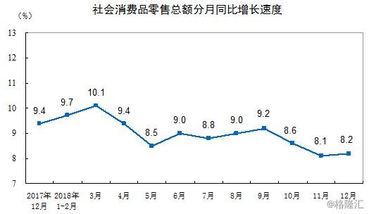 单单12月份,社会消费品零售总额35893亿元,同比名义增长8.2%,增速比11月份提高0.1个百分点。其中,限额以上单位消费品零售额15084亿元,增长2.4%。