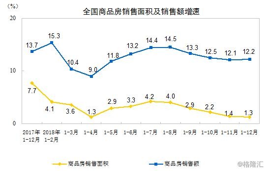 2018年,商品房销售面积171654万平方米,比上年增长1.3%,增速比1-11月份回落0.1个百分点,比上年回落6.4个百分点。其中,住宅销售面积增长2.2%,办公楼销售面积下降8.3%,商业营业用房销售面积下降6.8%。商品房销售额149973亿元,增长12.2%,比1-11月份提高0.1个百分点,比上年回落1.5个百分点。其中,住宅销售额增长14.7%,办公楼销售额下降2.6%,商业营业用房销售额增长0.7%。