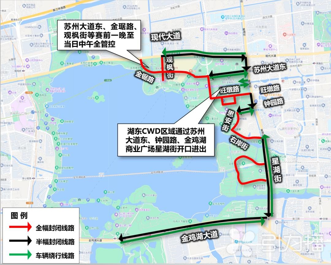 赛事期间,全幅封闭道路:观枫街、金琚路、苏州大道东(星湖街以西段)、华池街(苏州大道东至旺墩路段)、旺墩路(星湖街以西段)、丰融巷、锦融街、右岸街、思安街、钟园路(星湖街以西段)、四季路、良益思巷、李公堤商业街、星州街(中新大道西至芙蓉街段)、苏州大道西(星阳街至星兰街段)、星阳街、星港街(苏惠路至现代大道段),上述道路禁止所有车辆、非参赛行人在赛道内通行。