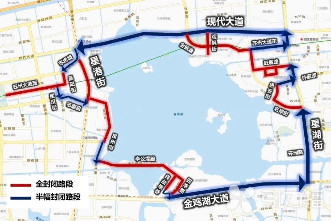 赛事期间,赛道一侧封闭道路:现代大道(星港街至星湖街段)、星湖街(现代大道至淞江路段)、金鸡湖大道(淞江路至四季路段)、星州街(李公堤路至中新大道西、芙蓉街至星港街段)、苏惠路(星港街至星汉街段)、苏绣路(星阳街至星港街段),上述道路禁止所有车辆、非参赛行人在赛道内通行;