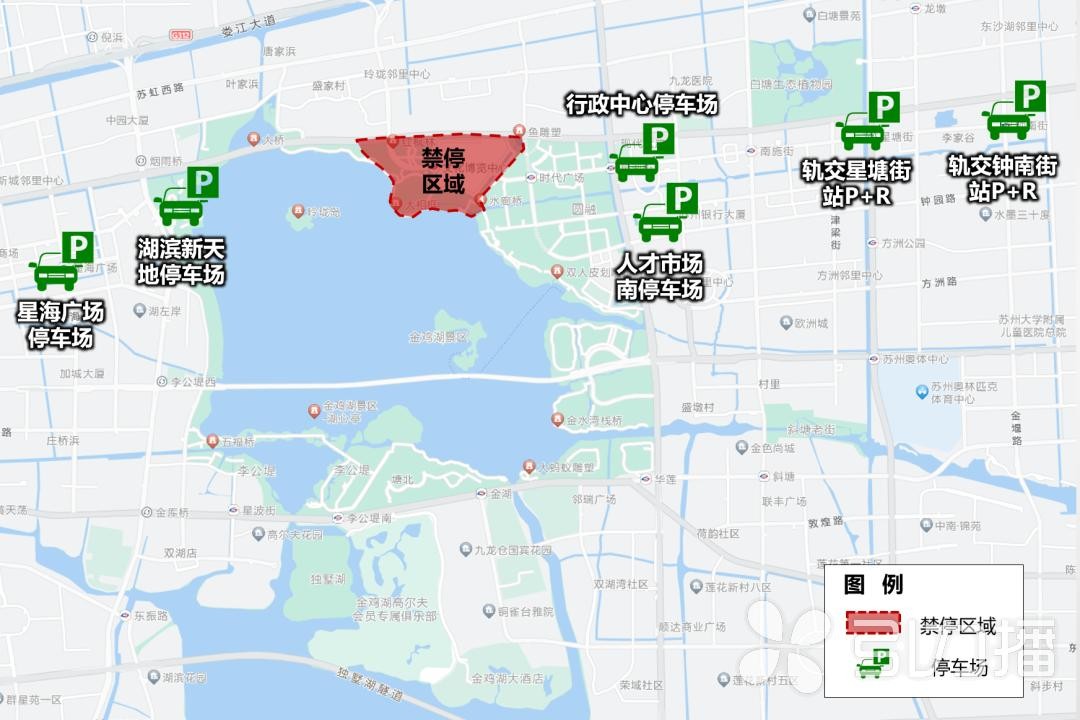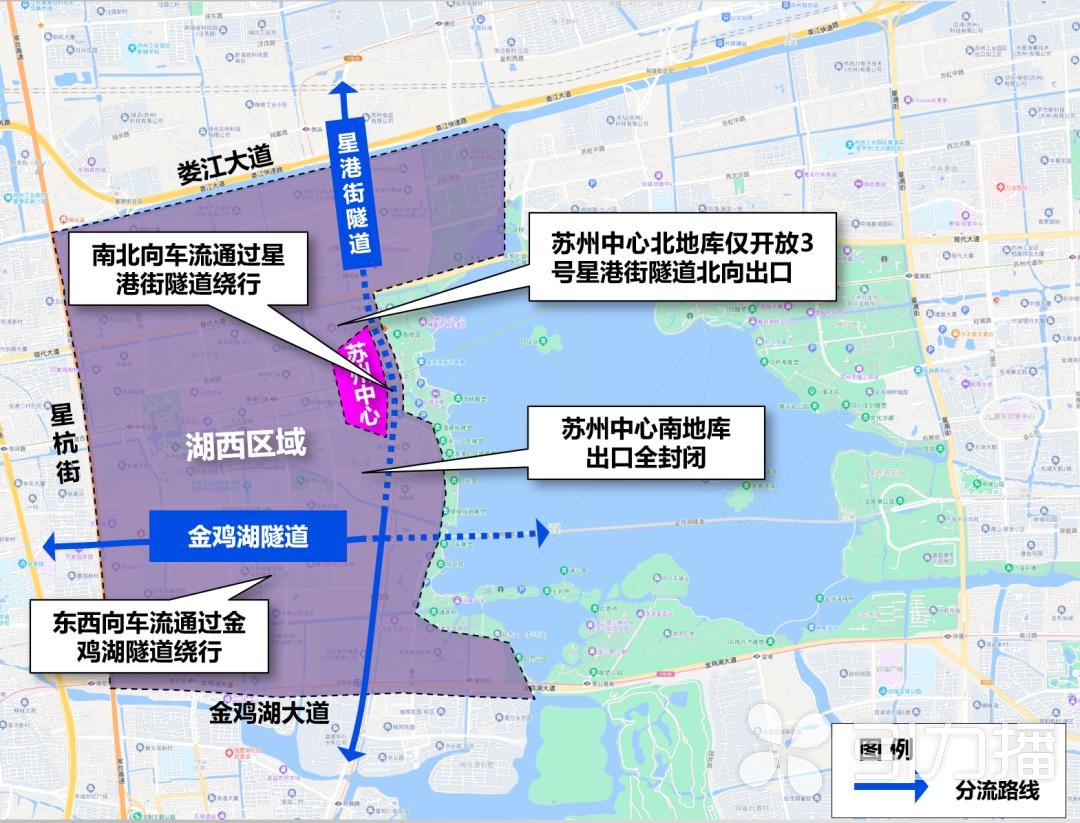 (2)湖西区域绕行:南北向车流通过星港街隧道,东西向车流通过金鸡湖隧道等道路绕行;苏州中心南地库出口全封闭,北地库仅开放3号星港街隧道北向出口。