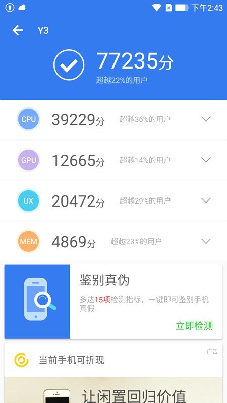 除了原生应用外,YOTA3还具有微信、微博、腾讯视频等常用App,使用起来很方便。而在安兔兔跑分当中,YOTA3取得了77235分,跑分表现一般。小编在滑动屏幕或进行日常手机操作时,并未发现卡顿现象,玩起游戏来虽比不上拥有怪兽性能级别的手机,但也能满足用户的基本使用需求,毕竟这么一款具有商务定位的阅读手机,主攻的也并非性能。