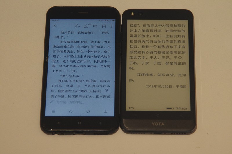 YOTA3墨水屏不属于自发光墨水屏,具有无蓝光、防眩光等作用,同时通过纺织痕工艺处理,也保持了手机清洁。很多人会担心两面都是屏幕,双开屏幕很费电,然而YOTA3完全免去了消费者的顾虑,设计了背屏单开的功能,关闭正面彩屏即可单独进入墨水屏的纯阅读模式。阅读体验上,电纸书字体清晰且锐利,比起手机的字,看起来更舒服且更有阅读纸质版书籍的既视感。