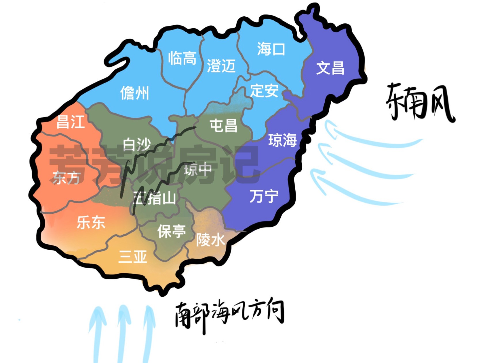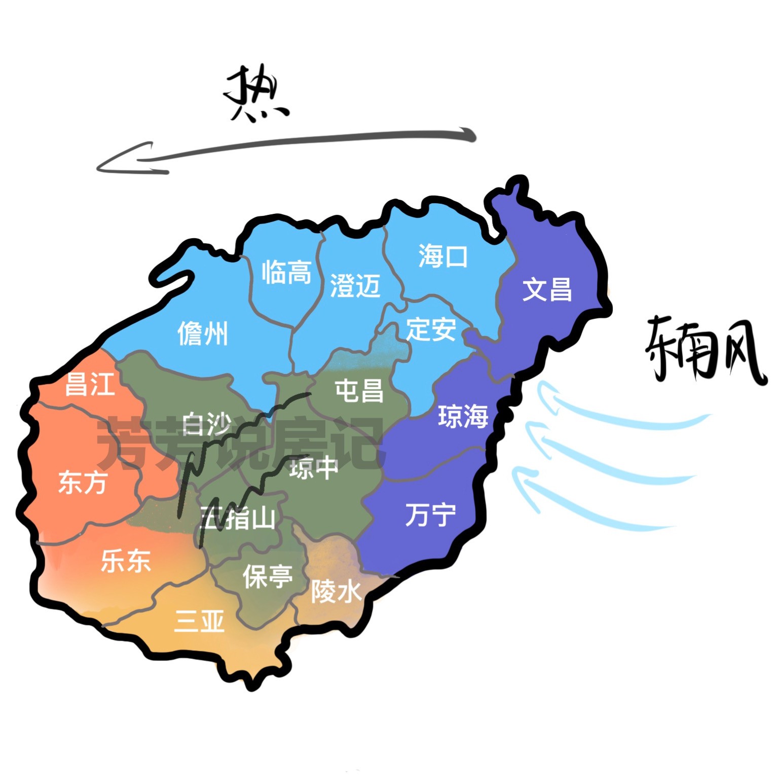 还是这张海南五大气候区的图片,非常贴合海南夏季差异特点。海南夏天受副热带高压影响,全岛盛行东南风,海上吹来的东南风会带来海洋大量的水分子到陆地,就会导致日照长而降水少的地方会比较热,再加上沿海不同区域海风方向差异,以及西南干热气流等影响,综合因素才形成海南夏季气候差异。
