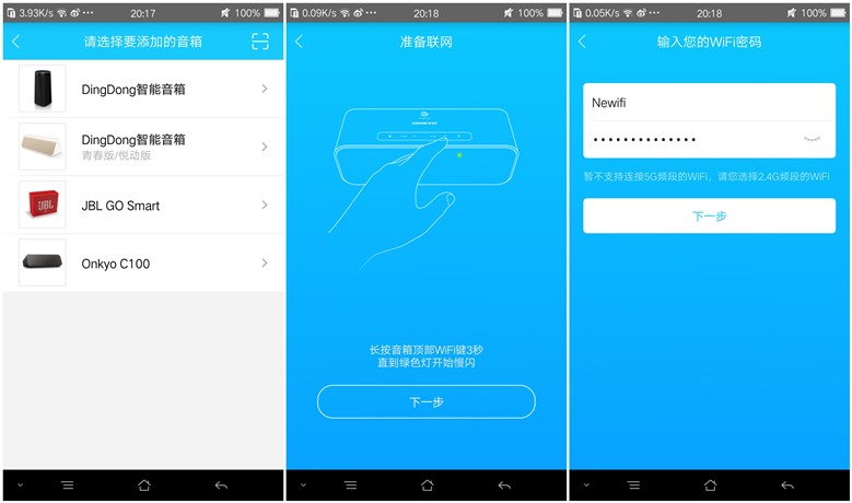 步骤二、选择要添加的音箱,长按音箱顶部wifi键3秒,然后在手机客户端APP中输入无线网密码。APP会把网络SSID和密码转换成声波传给音箱,音箱收到声波信息后会自己连接至无线网络,整个配置过程还有语音提醒。