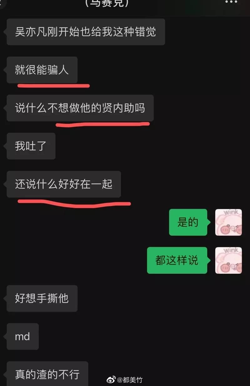 据传中间人不只一位,但目前不论是中间人或是都美竹所说的吴亦凡撩妹专用的帐号都已经注销。都美竹强调,自己只认事实,做过的事一定承认,但没做过也绝不背锅,希望能藉由自己的爆料警示其他女生,不要被眼前的完美人设欺骗,看清事实吧……。