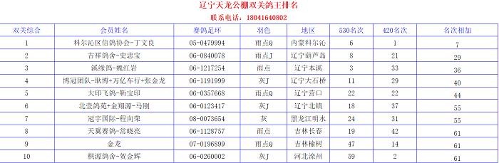本届赛事双关鸽王头甲来自科尔沁区信鸽协会-丁文良,足环号05-0479994参赛鸽,该羽赛鸽也是第二关420公里比赛的单关冠军,决赛关单关第六名,实力强劲,双关鸽王实至名归!