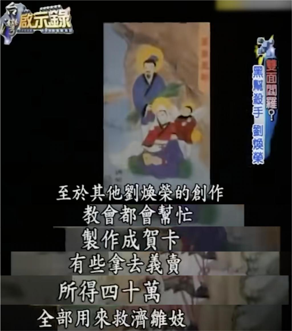 刘焕荣的画很抢手,最高价能卖到 90 万一幅,他则将所得收入全部用来救助雏妓,因为他曾说过:" 我们这种黑道帮派的人虽然坏,但不干买卖人口、妨害风化的事。"