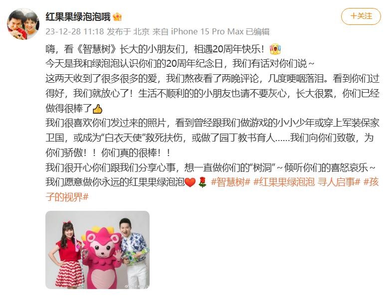 12月28日,《智慧树》开播20周年纪念日,红果果和绿泡泡发文,详情如下:
