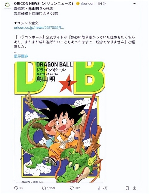 《龙珠》、《阿拉蕾》作者日本漫画家鸟山明因病去世享年 68 岁