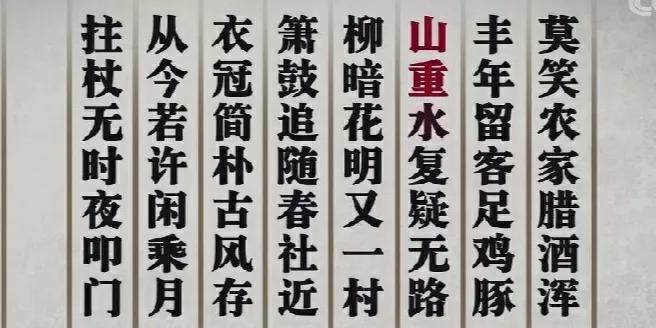 【翻译】不要笑话农家的酒浑,丰收之年有丰足的佳肴款待客人。一重重山,又一道道水,疑惑无路可行间,忽见柳色浓绿,花色明丽,一个村庄出现在眼前。你吹着箫,我击着鼓,结队喜庆,春社祭日已临近,布衣素冠,简朴的古风依旧保持。从今日起,如果允许乘着月光闲游,我这白发老翁也要随夜乘兴,拄着拐杖,敲开柴门。