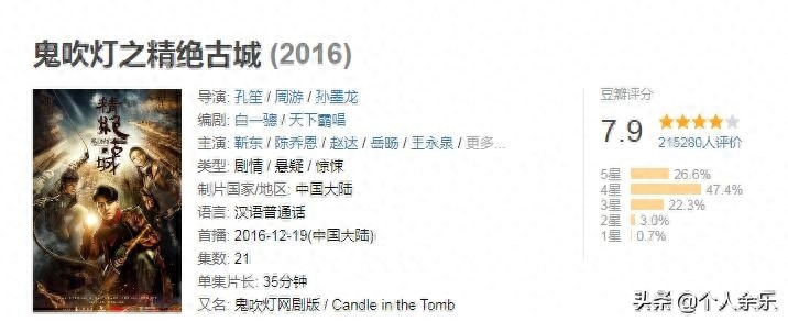 《精绝古城》是鬼吹灯系列的第一部电视剧,一经播出就掀起了一波鬼吹灯的追剧热潮,也给鬼吹灯系列影视剧定了一个很高的起点。