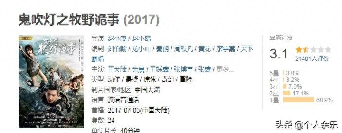 剧情不仅拖沓,还混杂了动漫、奇幻、无厘头等元素一起“乱炖”,显得不伦不类。打着《鬼吹的》的旗号,演着偶像剧的剧情,结果被骂得体无完肤。