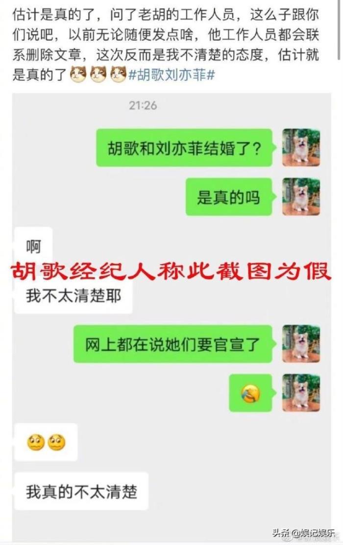 还有一张疑似胡歌工作人员的对话截图,聊天对话中,疑似胡歌工作人员对两人结婚消息表现出模棱两可的态度,加重粉丝对传闻的猜测。