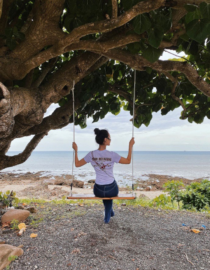 这件T恤正面看还没有什么特别之处,想不到背面如此花俏,背面印有印花的设计,正面和背面完全不一样的味道,如果说正面是气质风,那么背面就是个性不羁的时髦风,坐在秋千上,透着几分童真感。