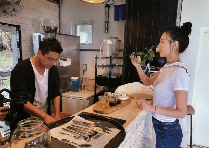 朱孝天也是好男人一枚,化身小厨男做饭,妻子则在一旁录制视频。