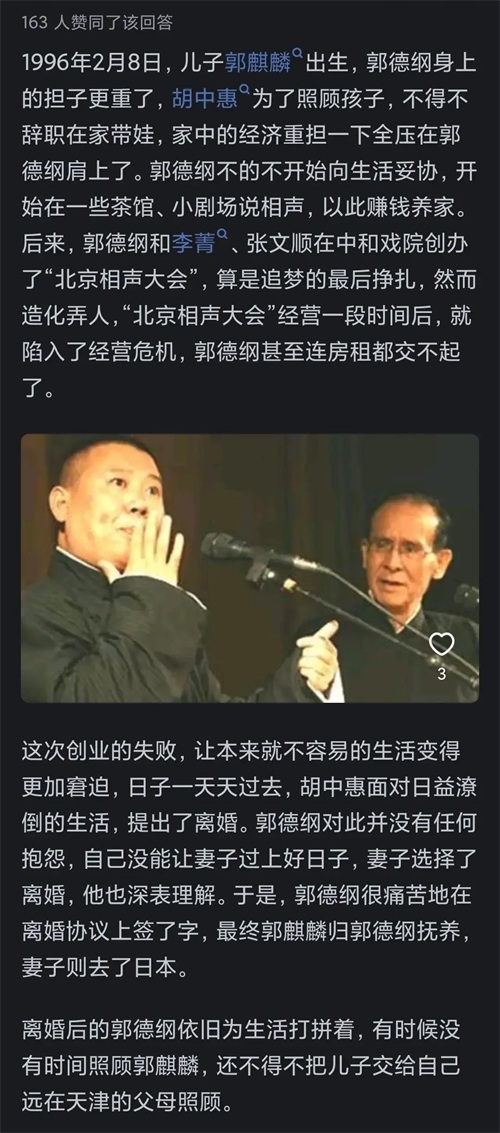 从郭德纲与前妻的婚姻问题,也让人不禁反思当代婚姻的诸多矛盾。忙碌的事业与家庭之间的平衡,子嗣的重要性,以及两个人相互理解和支持。
