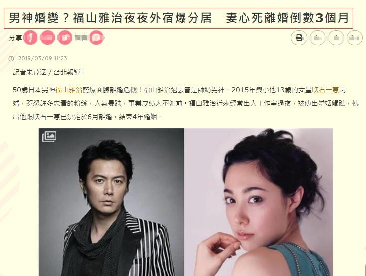 不过,在两年前,福山雅治却被爆出与吹石一惠闹婚变,在拍摄电视剧《集团左迁》时,福山雅治经常出入工作室过夜,被传出婚姻触礁,之后一度传出他跟吹石一惠已决定于离婚,结束4年婚姻。