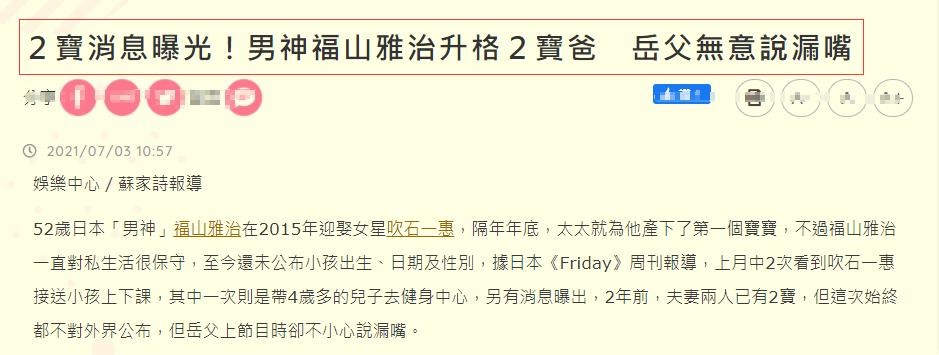 7月3日,据台媒报道,福山雅治夫妻两人在2年前已有二宝,但是始终都不对外界公布,不过岳父上节目时却不小心说漏嘴。