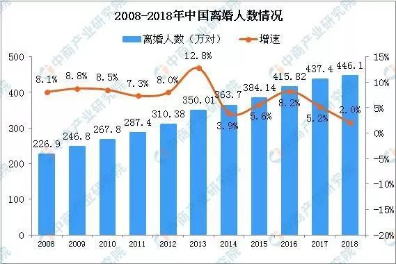 离婚率持续攀升,离婚登记数量也不断增加。2008年离婚人数仅226.9万对,2018年依法办理离婚手续的共有446.1万对,比上年增长2.0%。2019年全国离婚登记人数延续上升的趋势,2019年三季度全国登记离婚人数310.4万对,同比增长7.1%。