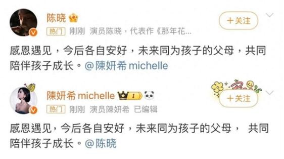 陈晓和陈妍希几乎同步的文案宣告离婚,直接终结了之前沸沸扬扬的传闻,这下真是坐实了。