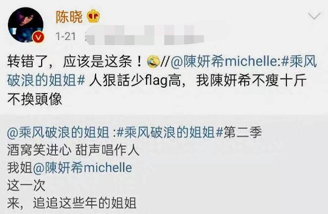 再看陈妍希参加浪姐的时候,两人关系也还是很好的,陈晓在微博上转发内容帮忙宣传,结果却不小心把微博转错了,大家当时还觉得他们俩挺有爱也挺可爱的。