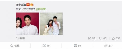 3日早,演员李光洁晒与妻子隋雨蒙的合照宣布结婚,配文:“早安我的太太”。隋雨蒙,90后,出生于黑龙江省哈尔滨市,中国内地女演员,毕业于中央戏剧学院表演系本科班。2013年,接拍古装剧《上官婉儿》正式进入影视圈。2015年,凭借古装传奇剧《琅琊榜》中的谢绮一角受到关注。2016年4月,出演的都市职场女性剧《欢乐颂》播出。