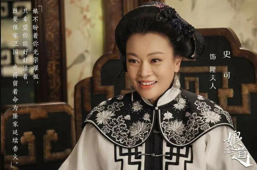 《娘道》中史可出演了雍容华贵、沉稳冷静的隆夫人,尽显大户人家当家女主人的威严和高雅。而对于曾在《血色残阳》、《铁梨花》、《红娘子》中多次成功出演太太角色的史可来说,尤其是在《勇敢的心》中大量哭戏和情绪浓烈场景的成功演绎,对于《娘道》中的隆夫人一角,应该是驾轻就熟了。史可不愧为中戏表演戏科班出身,称得上一名演技精湛的老戏骨。
