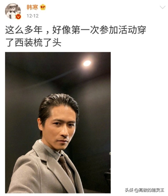 12月12日,韩寒参加活动时,还是长发,韩寒还自称这么多年,第一次参加活动穿了西装梳了头。