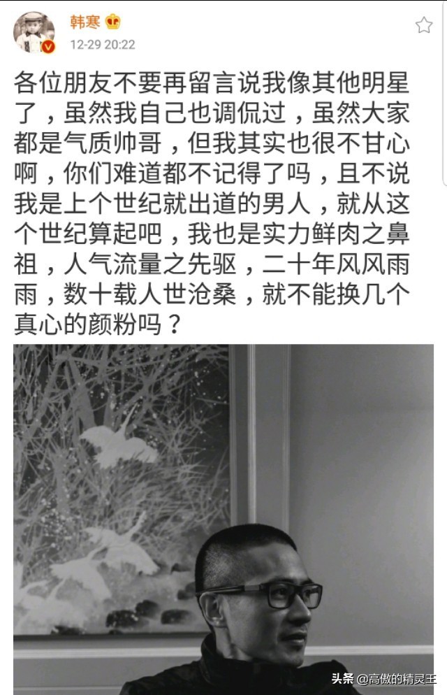 刚刚,韩寒在社交平台上发文称:"各位朋友不要再留言说我像其他明星了,虽然我自己也调侃过,虽然大家都是气质帅哥,但我其实也很不甘心啊,你们难道都不记得了吗,且不说我是上个世纪就出道的男人,就从这个世纪算起吧,我也是实力鲜肉之鼻祖,人气流量之先驱,二十年风风雨雨,数十载人世沧桑,就不能换几个真心的颜粉吗? "并晒了一张自己的黑白色照片。