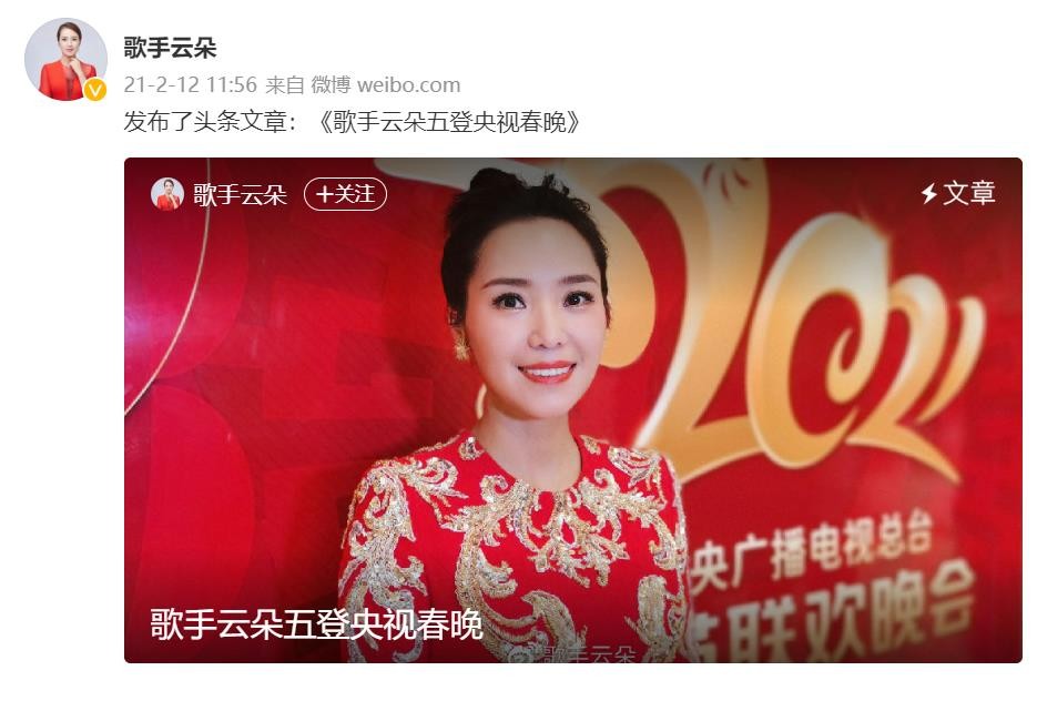 云朵通过微博发布文章《歌手云朵五登央视春晚》