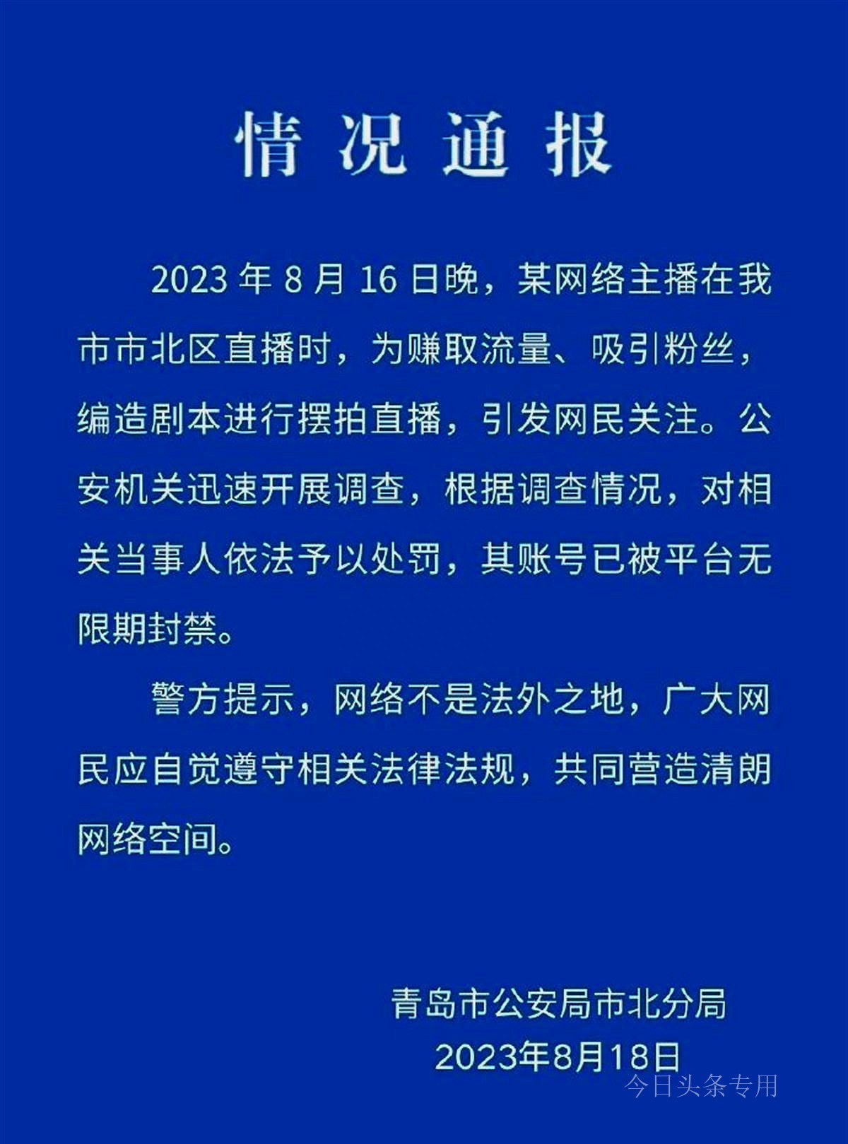 在8月16日,青岛警方发布通报称,某网络主播在青岛市市北区进行直播时,为了吸引流量和粉丝,编造了一个虚构情节进行直播,引发了网民的关注。公安机关立即展开了调查,并根据调查结果,对相关当事人依法予以了处罚,同时该主播的账号也被平台无限期封禁。
