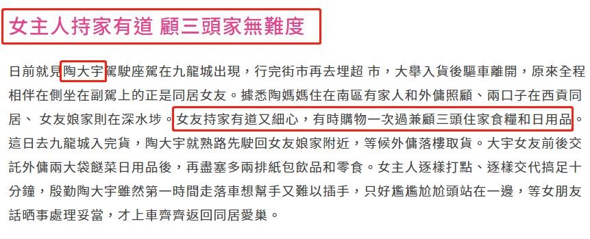 港媒爆料称,相恋10多年,女友不仅对陶大宇体贴入微,还把九十多岁的陶妈妈照顾得很好,同时还能兼顾自己的“娘家”,是一个勤俭持家的好女人。